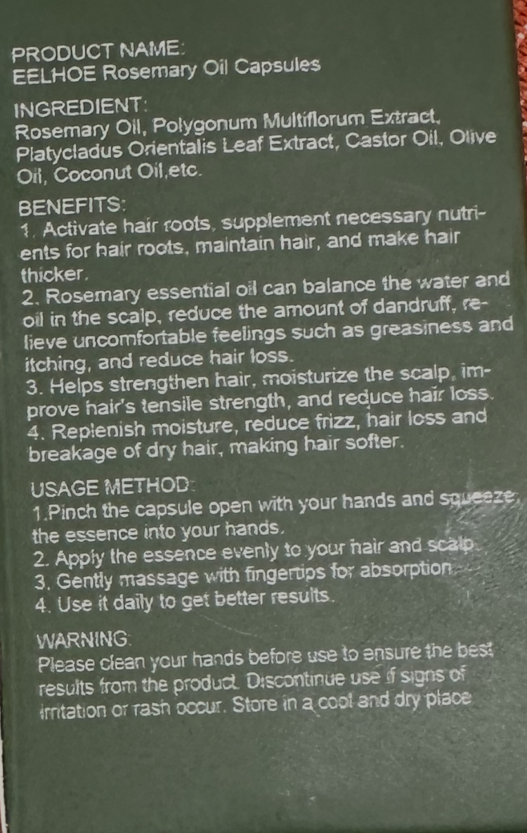 Nourish your hair from within with Eelhoe's Rosemary Oil Capsules. Our 30-day supply of rosemary oil capsules helps strengthen hair follicles, promote hair growth, and improve overall hair health.