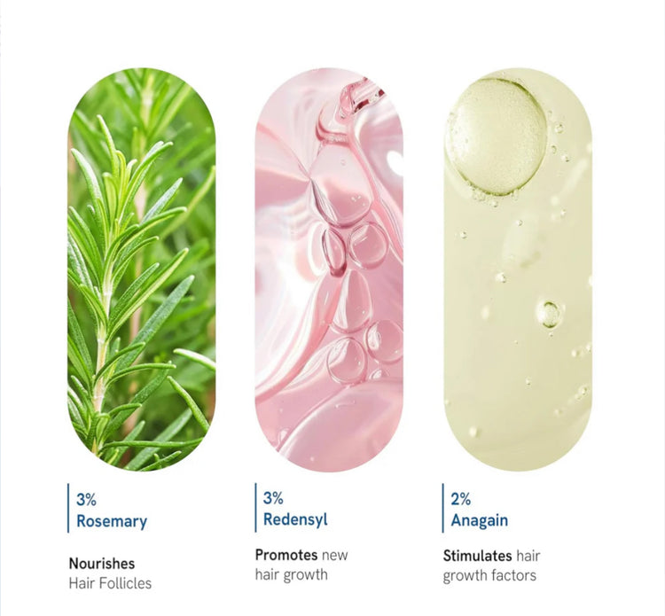 Ingredients: 23% Hair Growth Actives (3% Rosemary, 3% Redensyl, 2% Anagain, 2% Aminexil)